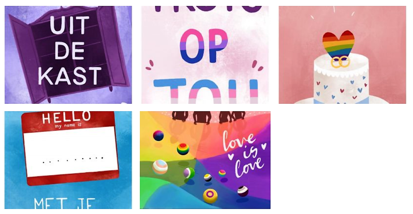 Onze illustrator Esther (@estherjillustration) heeft vier van de vijf ontwerpen op de kaart gemaakt, die je hieronder kunt bekijken. De kaarten die je thuis krijgt, zijn zonder watermerk. We hebben daarnaast een ontwerpwedstrijd gehouden voor de illustratie van de vijfde en laatste kaart. Anne Vree (@annevreeillustration) ontwierp de laatste kaart, met het thema ‘Pride’. In totaal zijn er dus: