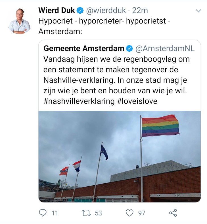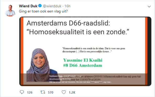 Wie niet zwijgt is de extreem-rechtse hoek; PVV leider Geert Wilders en propagandist Wierd Duk roeren zich wel op Twitter, maar die gooien er nog gewoon een xenfofoob schepje bovenop. Blijkbaar zijn wij als queers alleen maar interessant voor hen als wij misbruikt kunnen worden voor hun agenda van haat.