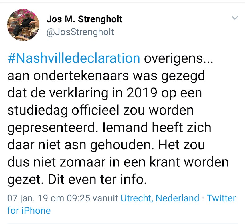 De lijst met ondertekenaars van de van de Nashville verklaring is inmiddels offline gehaald. De eerste ondertekenaars die hun steun voor de verklaring hebben ingetrokken zijn ook al gesignaleerd. Niet omdat ze tot inkeer kwamen omdat ze zagen hoeveel pijn en leed de verklaring veroorzaakte… Integendeel, ze hebben spijt omdat ze betrapt zijn op het publiekelijk uitdragen van haat. De boodschap zélf willen ze nog altijd extra kracht bijzetten. Zoals deze theoloog dat op Twitter doet: