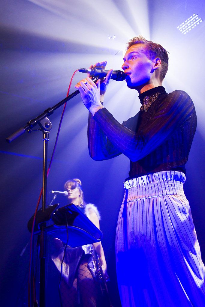Tijdens de showcase van Reindier op 9 april is het net alsof je je midden in een soort sprookjes-disco bevindt. Toetsenist Rosa Sanne betreedt het podium met twee zeer indrukwekkende roze knotjes, en ook de achtergrondzangeressen lijken zo uit een glitterparadijs te zijn gestapt. Reinier draagt een wit pak met een doorschijnend zwart shirt. Hij draagt rode lippenstift. De muziek is snerpend, aanstekelijk, akelig mooi en over de top. Maar nooit is het too much. Enerzijds raakt het de diepste dallen van je ziel, anderzijds waan je je bij een opzwepend popconcert. Vanaf het eerste moment is het publiek getuige van een spectaculaire show met dans, muziek en theater. De zangeressen pakken de stukjes van de zang op die Reinier niet meer haalt maar toch weet ‘ie keer op keer de aandacht naar zich toe te trekken. Het is die blik. Diezelfde blik die iemand als Perfume Genius ook heeft. Die doordringende kracht om door te gaan na een tragisch moment uit je leven. Of dit nu verslaving is, zoals bij Perfume Genius, of het verliezen van je stem. Wetende dat er een verhaal achter de muziek schuilt wordt Reindier beetje bij beetje boeiender. ‘Ik ben zo blij,’ zegt Reinier opgelucht na de show. ‘Dit voelt goed zeg!’