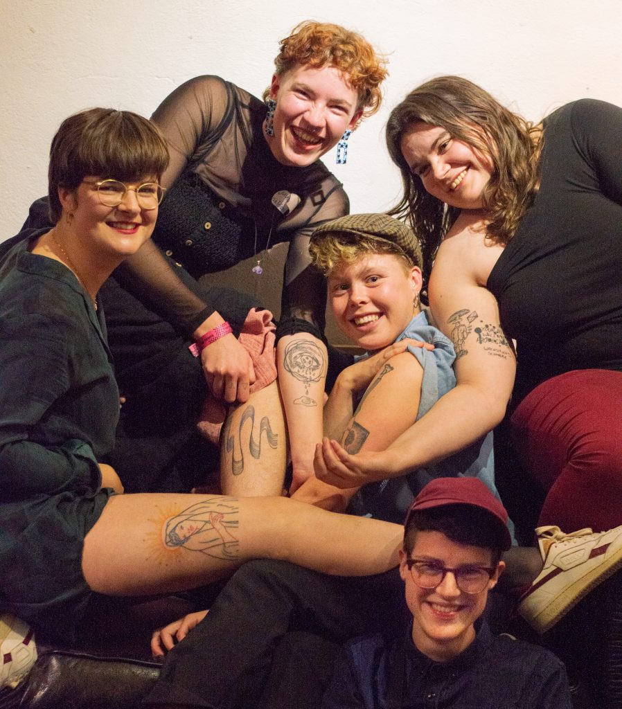 “Daarnaast is het ook heel leuk dat mensen die ik tatoeëer weer vrienden of kennissen van vrienden zijn. Mensen zeggen weleens, “oh nu hoor ik er ook bij,” omdat die dan een tattoo van mij hebben. Dat heb ik met jou ook meegemaakt, dat je elkaar tegenkomt op een queer feestje en dan kom ik zo tien mensen tegen die tattoos bij mij hebben laten zetten. Er is ook een groepsfoto bij een queer spoken word avond van vier mensen met tattoos van mij. Het is heel bijzonder dat mensen het als een gevoel van community ervaren dat ze een tattoo van mij hebben.
