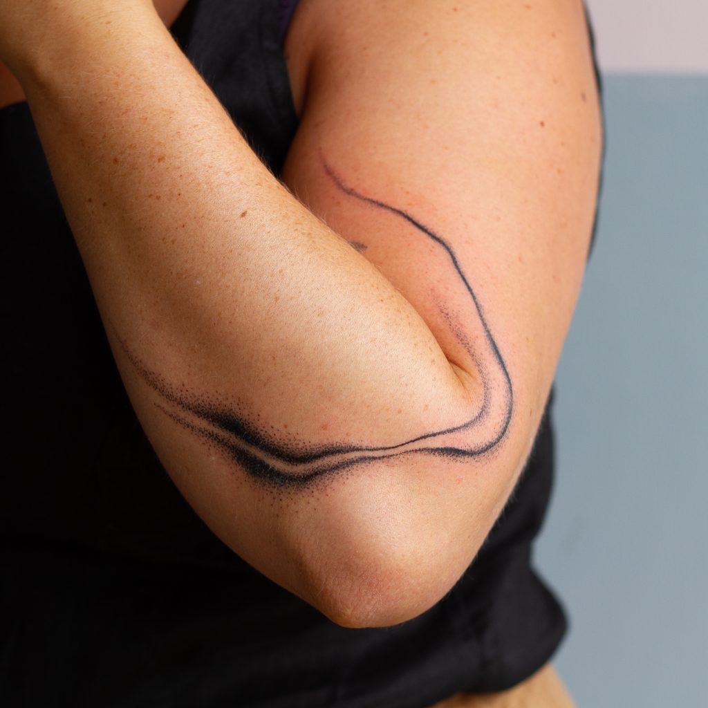 Wat ik in al mijn werk terug zie komen, is dat er veel beweging in zit. Ik maak zowel abstracte als figuratieve dingen. Dan kun je denken aan dingen die helemaal niet herkenbaar zijn als “iets,” bijvoorbeeld abstract lijnwerk, maar ook aan dingen die wel herkenbaar zijn, zoals een mens, plant of dier. Mijn werk is snel getekend, er zit veel beweging in, zowel in het tekenen als hoe het uiteindelijke beeld eruit ziet. Daar ben ik in het proces ook al mee bezig: hoe kan ik die schwung die erin zit tijdens het tekenen er ook in krijgen tijdens het tatoeëren? Dat vind ik een hele leuke uitdaging.