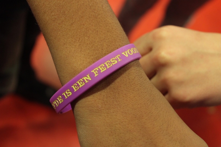 Steeds meer scholen vieren Paarse Vrijdag. Zes jaar geleden deden er nog maar 150 scholen mee. Dit jaar heeft het COC Nederland 1100 Paarse Vrijdagpakketten met daarin een half miljoen polsbandjes weggegeven. Jeremai van het Stanislascollege draagt de polsband speciaal voor zijn vriend. “Hij weet nog niet zo goed op wie hij valt.” Het maakt hem helemaal niet dat zijn vriend nog zoekende is naar zijn seksualiteit, en dat is waar Paarse Vrijdag daadwerkelijk om draait.