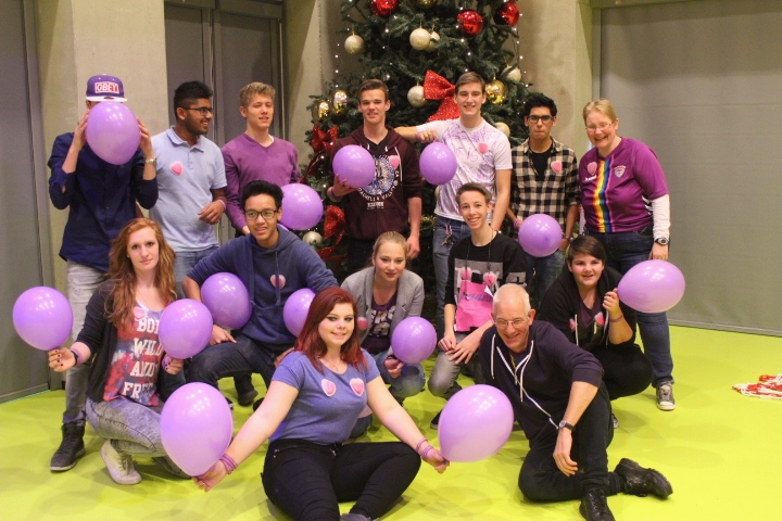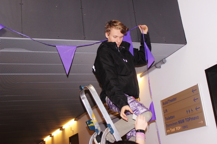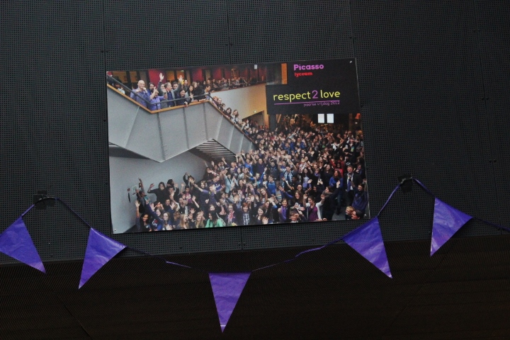 De GSA van het Picasso Lyceum in Zoetermeer heeft ruim een maand gewerkt aan de organisatie. Het is bijna één uur als uit de speakers in de aula het welbekende Y.M.C.A klinkt. Het lied wordt onderbroken door een oproep uit de intercom: “Om tien voor één gaan we de foto maken voor Paarse Vrijdag. Mis het niet.” De hal loopt langzaam vol, en de drie fotografen staan op de bovenste verdieping klaar om de foto te nemen. Elk jaar wordt een foto gemaakt van iedereen die Paarse Vrijdag steunt. De foto wordt vervolgens een jaar lang opgehangen in de school.